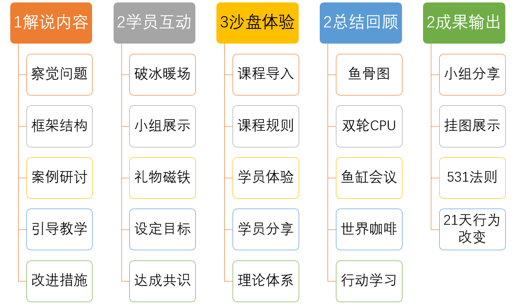 問(wèn)卷測(cè)評(píng)、小組討論、角色扮演、沙盤模擬、視頻研討、點(diǎn)評(píng)講解、引導(dǎo)技術(shù)(團(tuán)隊(duì)共創(chuàng)等)。